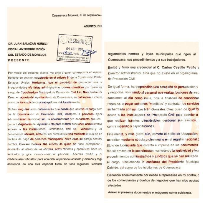 Desde septiembre del 2024 la titular de Protección Civil de Cuernavaca, fue denunciada ante la Fiscalía Anticorrupción pero nadie en esa dependencia con su ex titular, Juan Salazar Nuñez o alguien en el ayuntamiento capitalino hizo algo para investigar los abusos o irregularidades de la funcionaria municipal o que estaba era lo que  estaba pasando en esa oficina.
