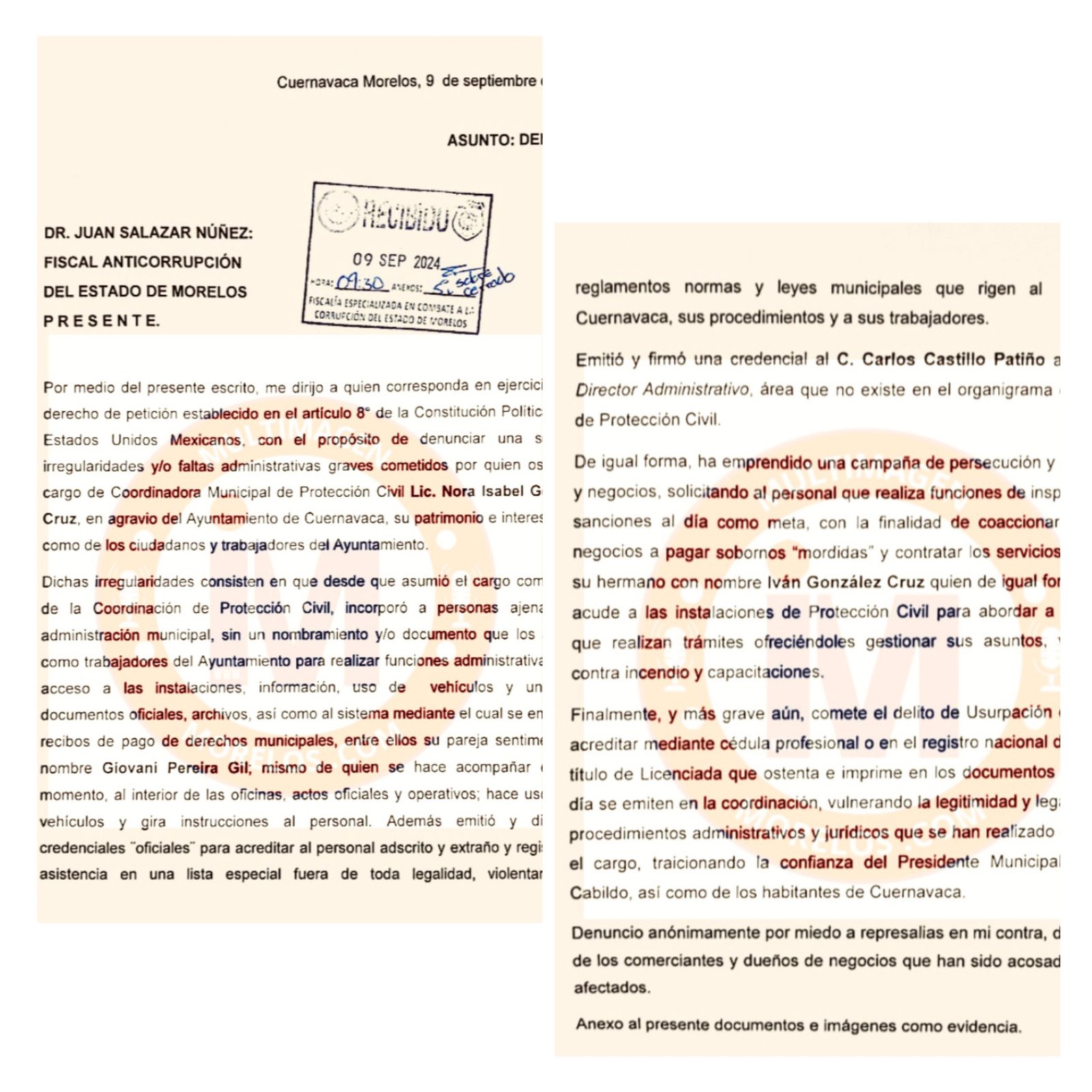 En oficio con fecha 09 de septiembre del 2024, dirigido al entonces fiscal la denuncia refiere que “en el derecho de petición establecido en el artículo 8° de la Constitución Política de los Estados Unidos Mexicanos, con el propósito de denunciar una serie de irregularidades y/o faltas administrativas graves cometidos por quien ostenta el cargo de Coordinadora Municipal de Protección Civil Lic. Nora Isabel González Cruz”.