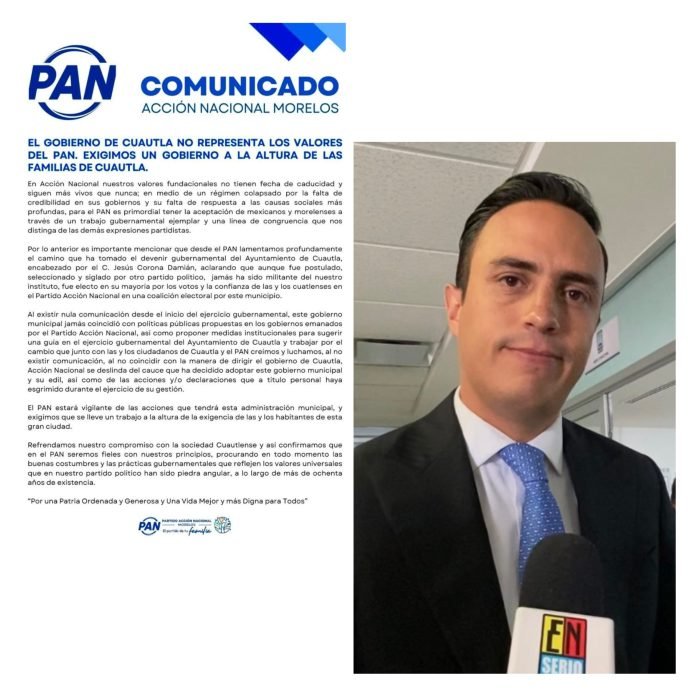 Por lo anterior, mencionó que “desde el PAN lamentamos profundamente el camino que ha tomado el devenir gubernamental del Ayuntamiento de Cuautla, encabezado por Jesús Corona Damián, aclarando que aunque fue postulado, seleccionado y siglado por otro partido político, jamás ha sido militante del nuestro instituto, fue electo en su mayoría por los votos y la confianza de las y los cuatlenses en el Partido Acción Nacional en una coalición electoral por este municipio”.