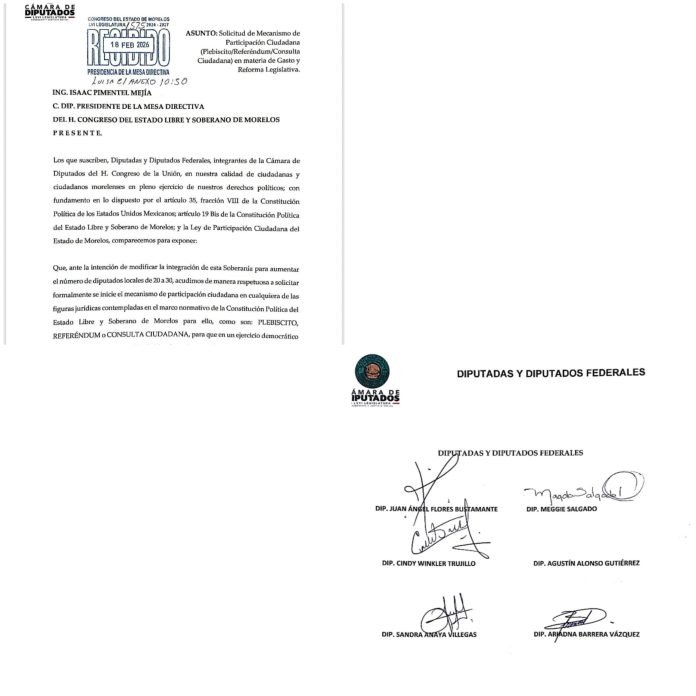 Cinco de los seis diputados federales por Morelos en el Congreso de la Unión, solicitaron formalmente a los legisladores de Morelos antes de aprobar el aumento de 20 a 30 el número de diputados realicen una consulta ciudadana y que sean los electores quienes decidan si es viable la propuesta.