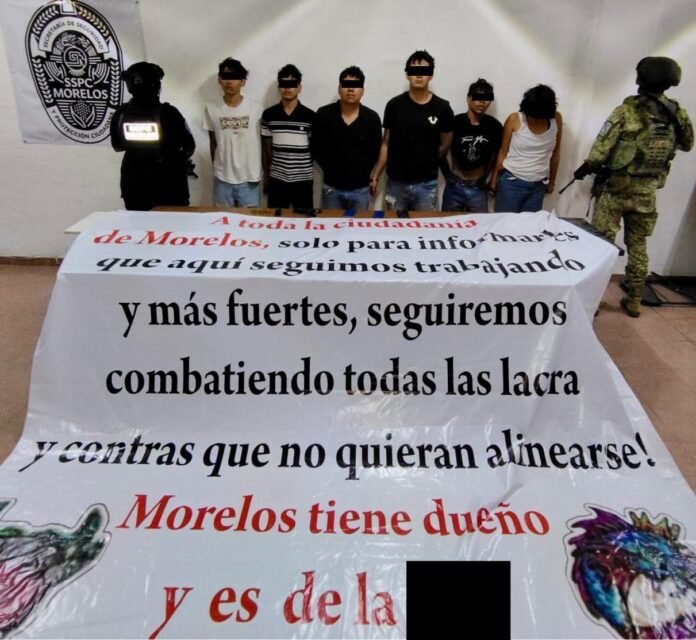 Derivado de recorridos de Vigilancia y Prevención del Delito en la carretera Jojutla-Yautepec, en el poblado de Huatecalco del municipio de Tlaltizapán, integrantes de la Mesa de Coordinación Estatal para la Construcción de Paz y Seguridad Morelos, aseguraron a seis personas cuando colocaban una lona blanca con un mensaje de amenaza firmado por un Grupo Delictivo.